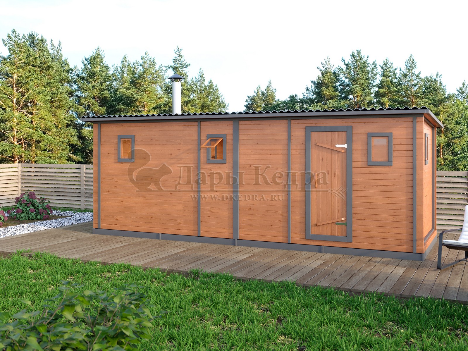Каркасно-щитовая баня из кедра «Макси» с верандой Это классическая прямоугольная модель бани с тремя отделениями: предбанником, моечной и парилкой. Для удобства пользования предбанник оснащен лавочкой и вешалкой. В моечной находится лавка и полочка из кедра. Парилка оборудована двухуровневым открытым полком и печью. Время растопки такой бани не превышает 30 минут. На просторной веранде можно оставить вещи или отдохнуть после парения. Каркасно-щитовую баню можно заказать как в готовом, так и в разборном варианте. В разборной модели готовые щиты из кедра быстро собираются в полноценное строение, что также позволяет исключить лишний строительный мусор. Такая баня не требует полноценный фундамент, поэтому при необходимости ее можно перенести в другое место. Обращаем Ваше внимание, что в стандартную комплектацию бани входит полок открытого типа в парной. Дополнительно можно заказать полок закрытого типа или лавку! Древесина кедра насыщена эфирными маслами и фитонцидами, которые активируются при воздействии температур. Таким образом, парение в каркаско-щитовых банях из кедра становится еще полезнее.