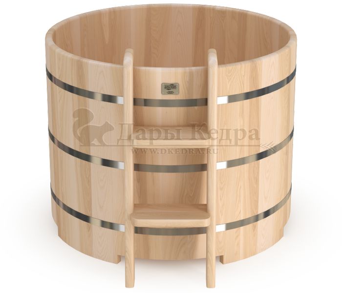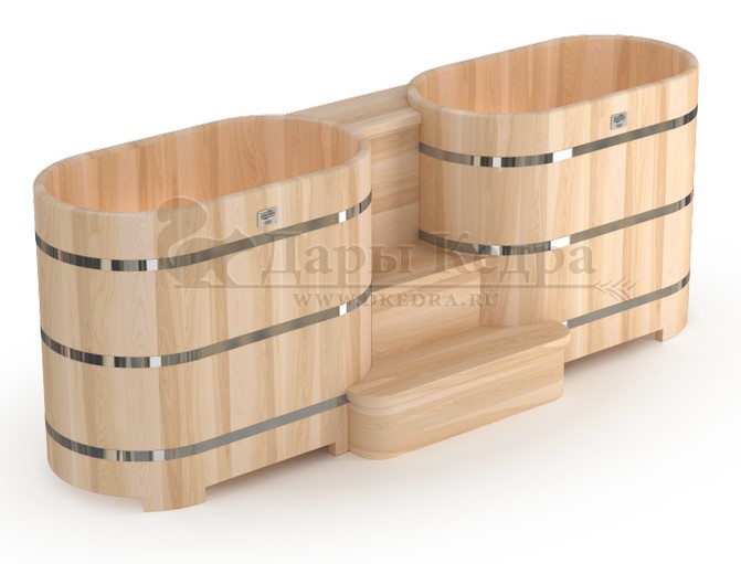 • Двойная овальная купель для бани из кедра Двойная купель из кедра чаще всего используется в крупных банных комплексах и оздоровительных центрах. Она представляет собой две овальные чаши для воды, в которых люди отдыхают после парения. Между купелями установлен широкий подиум из кедра, по которому могут спускаться и подниматься сразу несколько людей. Для комфортного отдыха купель оснащена лавочками и двумя дополнительными лестницами. Обручи из нержавеющей стали декорируют изделие и равномерно распределяют нагрузку воды во время пользования. При правильном уходе купель для бани не рассыхается и не подвергается гниению. При взаимодействии древесины кедра с водой активируются эфирные масла и фитонциды, благодаря чему организм насыщается полезными веществами.