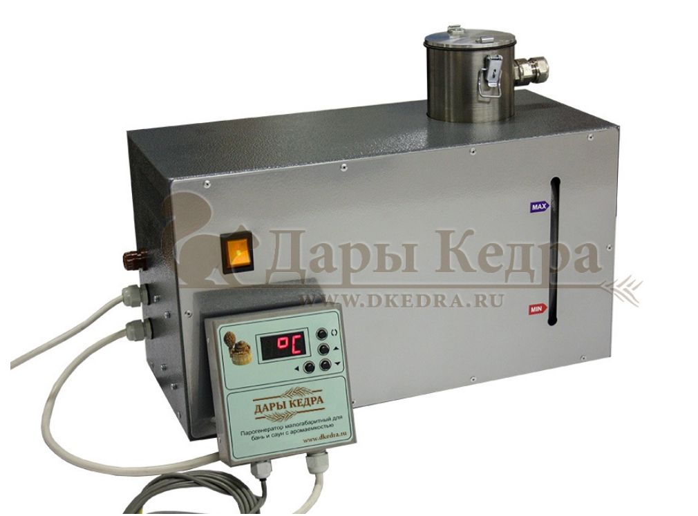 Парогенератор накопительный с цифровым блоком управления и таймером, 2,5 кВт Прибор служит для создания пара путем закипания воды. В металлическом корпусе парогенератора находится бак для воды со съемной аромаемкостью в виде сеточки. Рядом располагается индикатор в виде трубки, благодаря которому осуществляется визуальный контроль за уровнем воды. Парогенератор накопительного типа работает от электричества и не требует подключения к водопроводу. Вода в него добавляется самостоятельно. Для удобства пользования парогенератор имеет выносной пульт управления, который позволяет установить температуру, мощность и время процедур парения. При превышении заданной температуры и низком уровне воды устройство отключается автоматически. Звуковой сигнал таймера дополнительно сообщает об этом. Целебный пар поступает в фитобочку по паропроводу и насыщает организм человека полезными веществами.